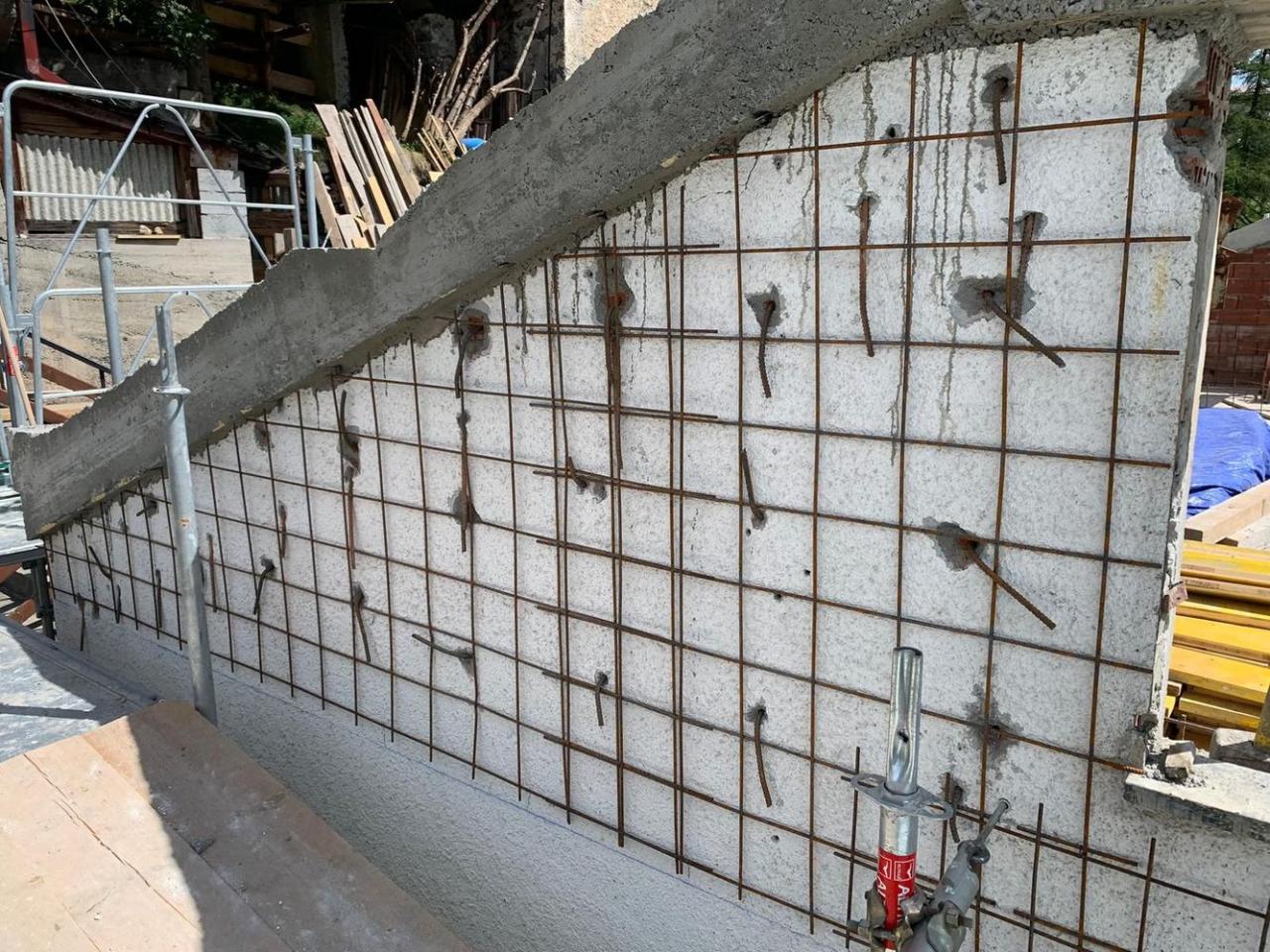 Successivamente è stato realizzato un rinforzo strutturale mediante: prima la costruzione in opera di un cordolo di sommità in calcestruzzo e poi l'applicazione di un intonaco armato sulle facciate. Infine è stato realizzato un cappotto termico esterno standard in EPS, di cui alcune parti in Aeropan® (isolante in grado di ridurre notevolmente la dispersione energetica utilizzando uno spazio limitatissimo).