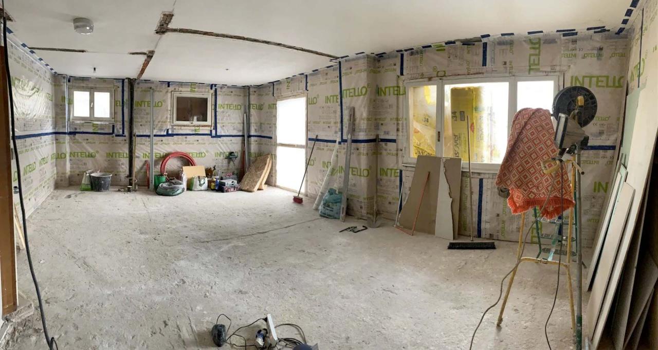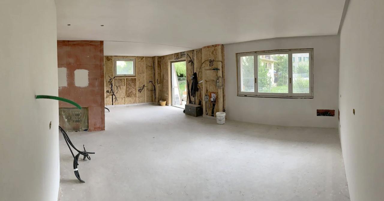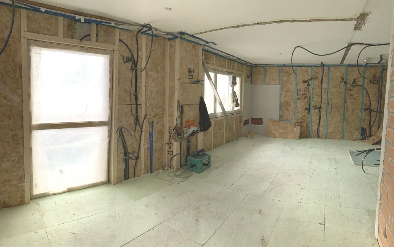 Raggiunto questo punto delle lavorazioni il cantiere è proseguito realizzando uno strato isolante a pavimento, per ridurre la dispersione termica verso il vano sottostante (non riscaldato). Lo strato di coibentazione termica in isolante tipo XPS è stato posato anche come appoggio per il successivo riscaldamento a pavimento. Per le pareti e contropareti interne si è scelto l'utilizzo di una struttura "a secco" con interposto un isolante di tipo lana di roccia e rivestimento esterno con pannelli in fibrocemento. Tale soluzione ha permesso un'elevata velocità di posa ed una facile integrazione impiantistica.
