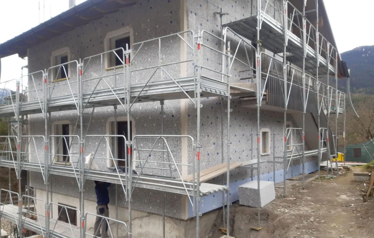 I materiali sono stati posati tramite i ponteggi installati lungo tutto il perimetro dell'edificio, necessari per portare a termine un cantiere edile completo, in tutte le sue sfaccettature.