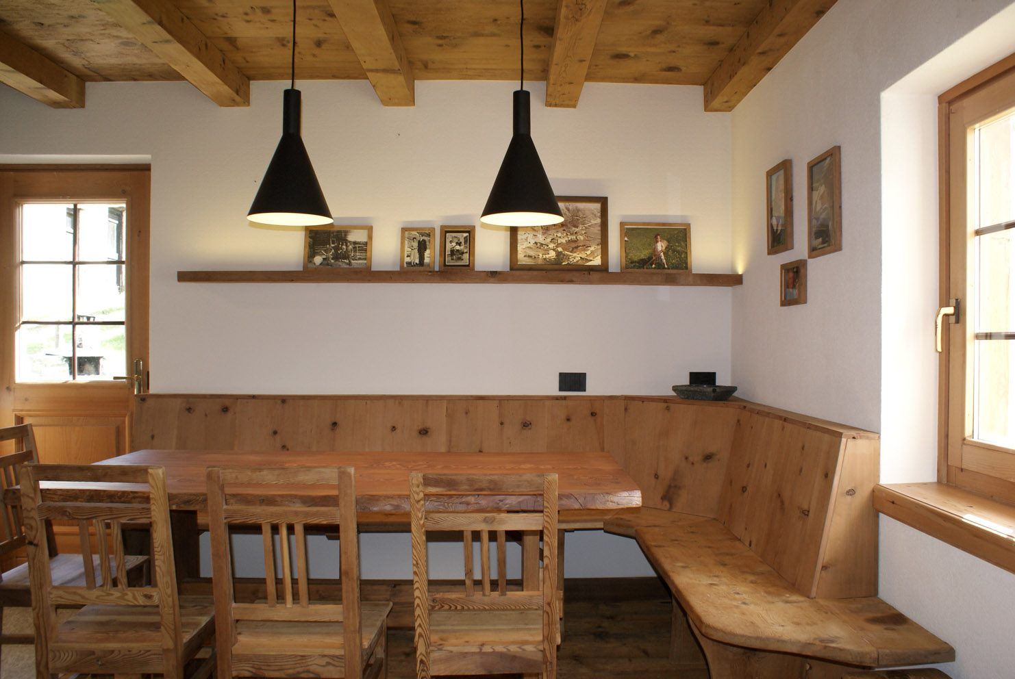 Tutti i rivestimenti utilizzati sono in legno vecchio, recuperato da stanze montane antiche, così come il pavimento in legno, che sono stati puliti, sistemati e posati, seguendo le regole e la tecnica dell’epoca.